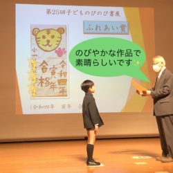 こんにちは🌸千桜です。この週末に『第25回子どものびのび書展』の表彰式が行われました。 146点の応募作品の中から、生徒さんが見事、【ふれあい賞】に選